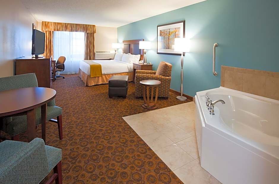 This room features a King bed with four pillows, a whirlpool tub, a work area with desk and ergonomic chair, a lounge chair with ottoman, a 37 inch HDTV, and small fridge. We have complimentary HSIA and local calls.